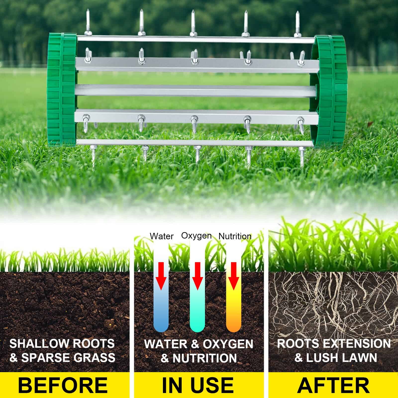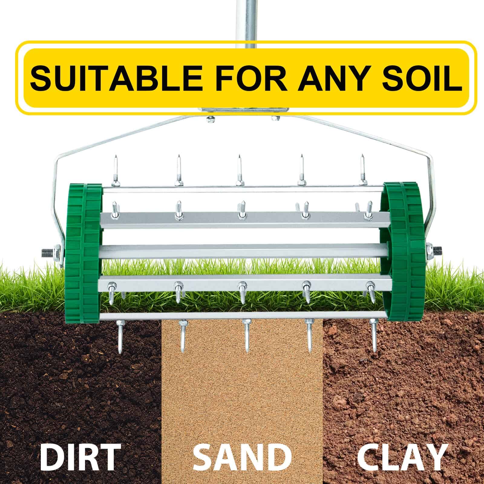 This rolling lawn aerator will help aerate your lawn and soil. The spikes on this aerator are made of sturdy galvanized steel combined with thickened tubing. As a result, it is entirely weatherproof and rustproof, not to mention extremely durable.